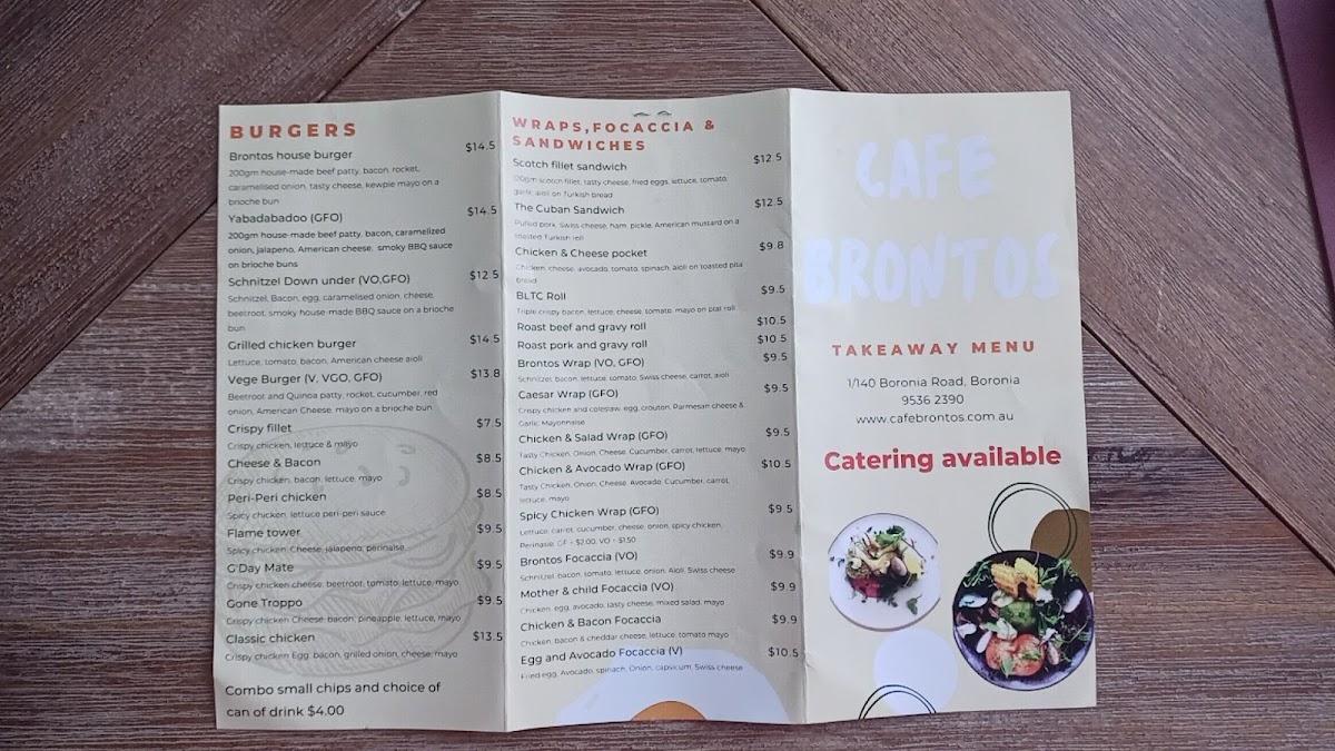 Guests rave about the generous portion sizes and the inviting atmosphere, complemented by friendly and attentive service. The signature breakfast wrap and fluffy pancakes are crowd-pleasers, perfect for family outings. With options like fresh smoothies and delicious iced coffees, there's a little something for everyone. Cafe Brontos truly stands out as a must-visit spot for brunch lovers in the area.
